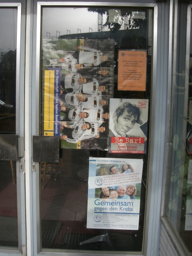 Eine ansonsten eher zweifelhaft anmutende Kneipe wirbt gern mit Plakaten für alles Mögliche. Und wo der Platz nicht ganz reicht, wird eben improvisiert: