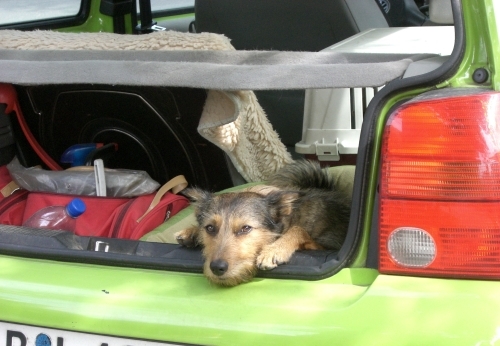 Der sitzt jetzt den ganzen Tag hier, Frauchen verkauft nämlich Brötchen im Imbiss gegenüber und da darf er nicht mit rein: